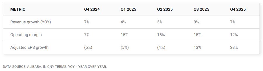 알리바바의 두 핵심 사업이 다시 성장함에 따라 비용을 절감하고 더 많은 주식을 매입했으며, 높은 margin의 클라우드 및 AI 사업에서 더 높은 수익을 창출하여 주당 순이익을 성장시켰습니다.