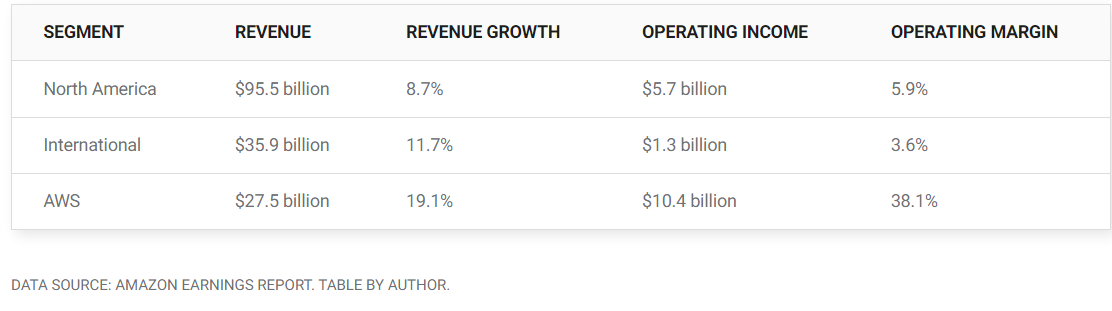 다음은 Amazon의 주요 부문과 지난 분기 실적을 요약한 것입니다.
