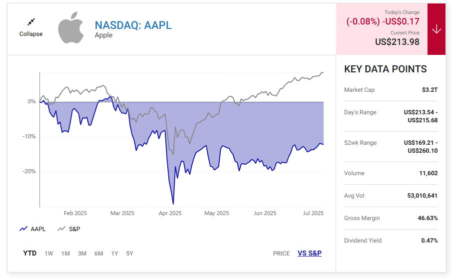 Apple 주가는 관세와 인공 지능 전략에 대한 우려로 인해 현재까지 15% 하락했습니다.