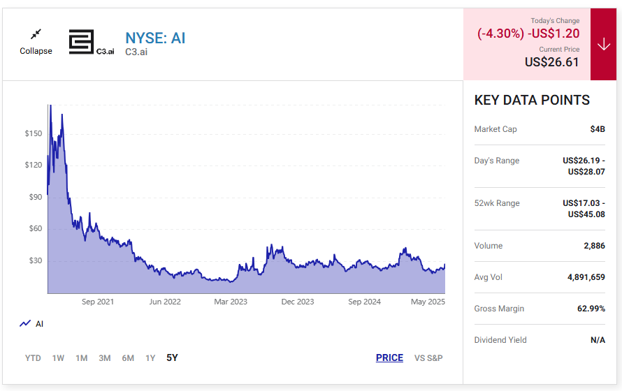 현재 C3.ai 의 시가총액은 주당 약 26.50달러로 2026 회계연도에 예상되는 4억 6,500만 달러의 7.5배에 달하는 35억 달러에 거래되고 있습니다.