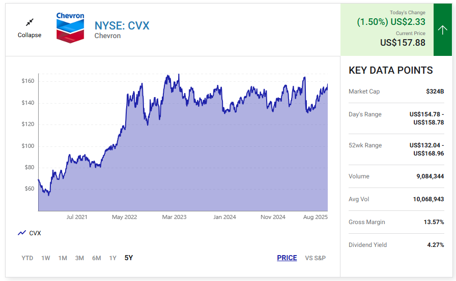 셰브론은 지구상에서 가장 큰 에너지 회사 중 하나이며 4.4%의 높은 수익률을 기록하고 있습니다.