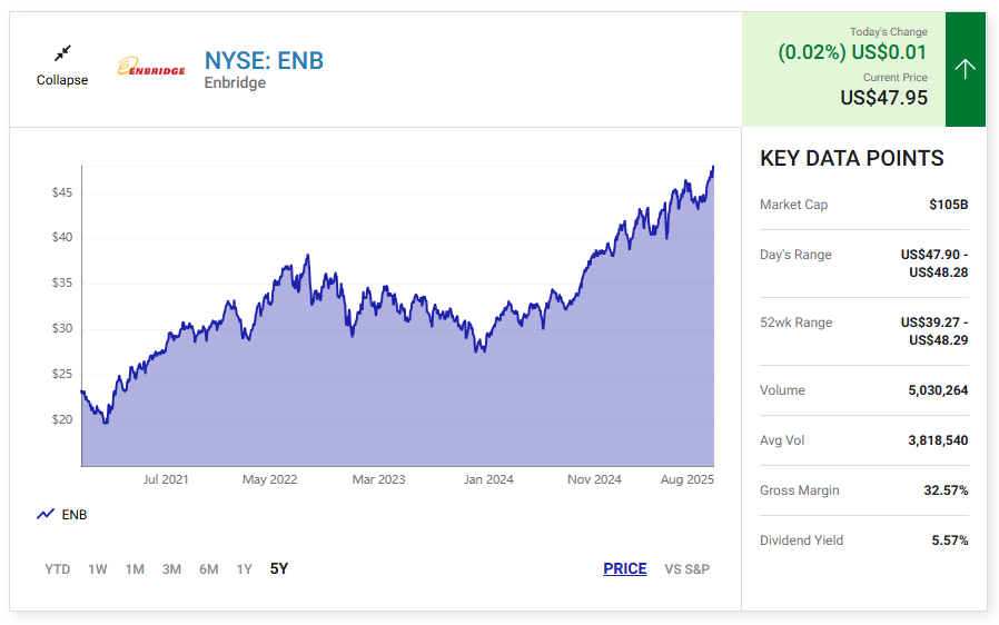 Enbridge는 북미에서 가장 큰 미드스트림 사업자 중 하나이며 5.8%의 수익률을 기록하고 있습니다.