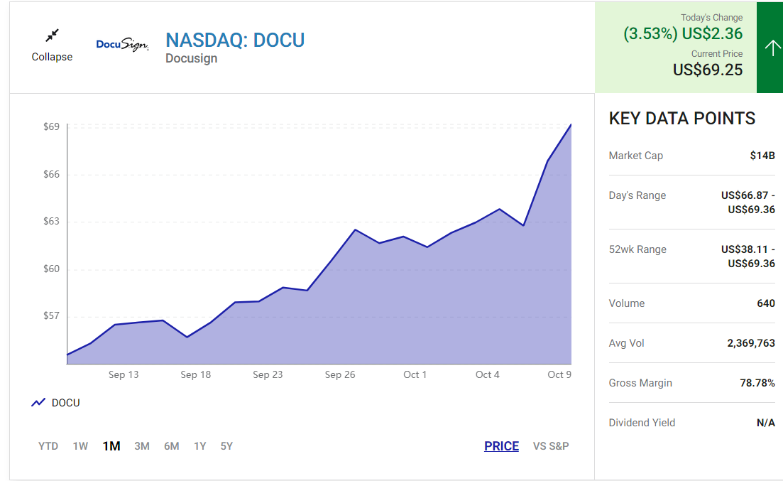 DocuSign.DocuSign 주가는 지난 12개월 동안 상승하고 있지만 여전히 2021년 최고치에 근접하지 못하고 있습니다.