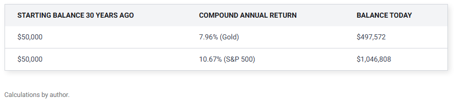 실제로 금의 가치는 지난 30년 동안 연평균 7.96%의 소폭 복리 수익률로 상승했으며, 같은 기간 동안 연평균 10.67% 성장한 S&P 500 지수에 이어 2위를 차지했습니다.