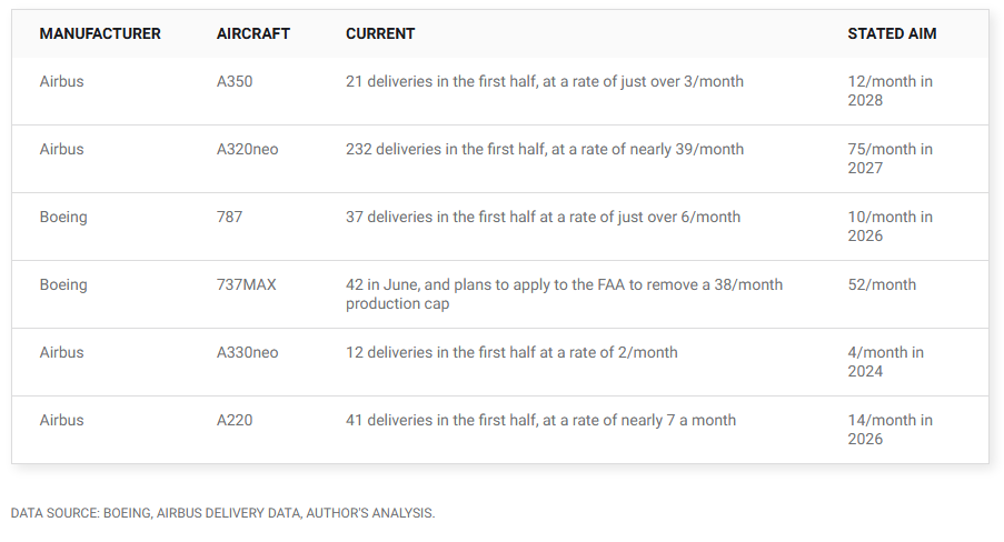 그의 말도 일리가 있습니다. 첫째, 엔진 제조업체인 GE 에어로스페이스는 2분기에 에어버스 A320neo 제품군과 보잉 737 MAX에 사용된 LEAP 엔진 인도량이 38% 증가했으며, 2025년에는 15~20% 증가할 것으로 보고했습니다.