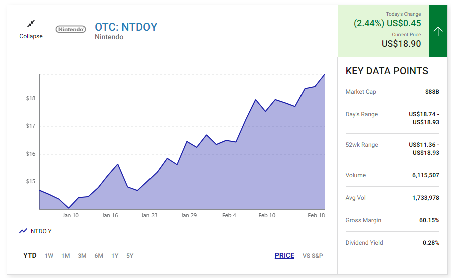 최근 몇 년간 게임 판매 증가로 인한 닌텐도의 마진 개선을 고려하더라도, 이 주식은 34달러의 고가의 선물 주가수익비율(P/E)로 거래되고 있습니다.