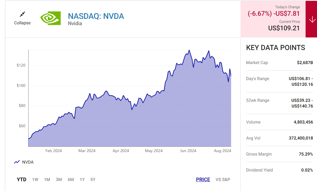 가격이 하락한 후에도 엔비디아 주식은 42배가 넘는 순익과 약 34배의 기업 가치 대비 배수에 거래됩니다.