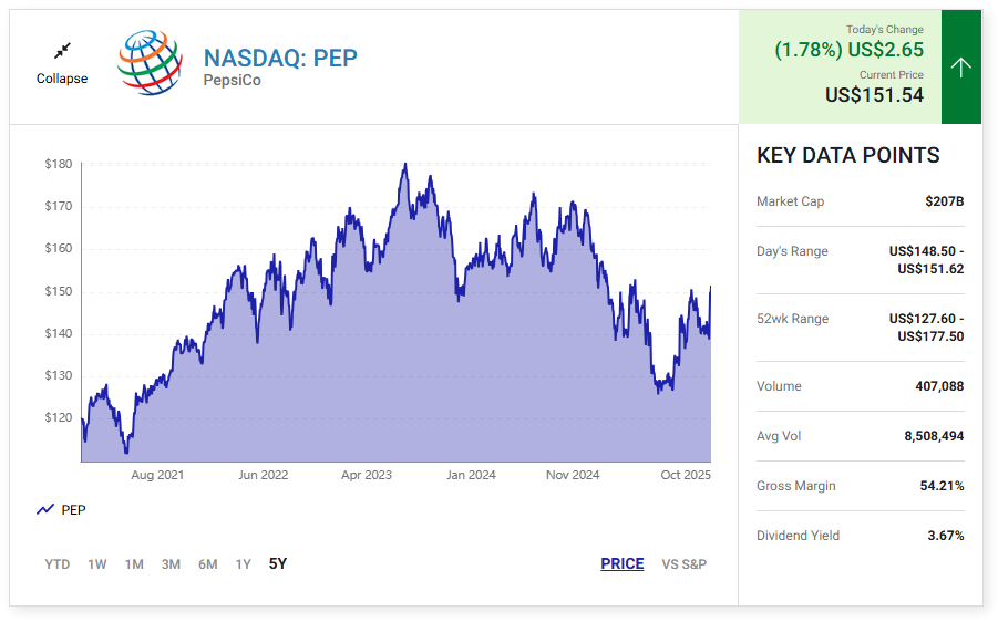 펩시코(PEP 1.78%)는 5년 만에 최고치를 기록한 이후 약 25%의 가치 하락을 기록했습니다.