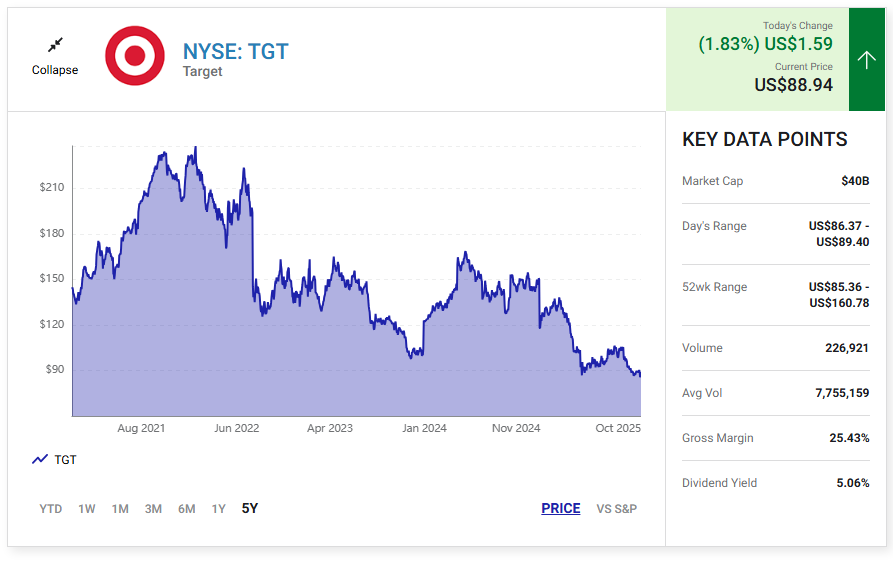 그리고 Target(TGT 1.83%)은 5년 만에 최고치에서 약 66% 하락했습니다.