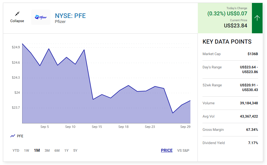 화이자 Pfizer (PFE 0.32%)의 주가는 하락세에서 벗어나지 못하고 있습니다.