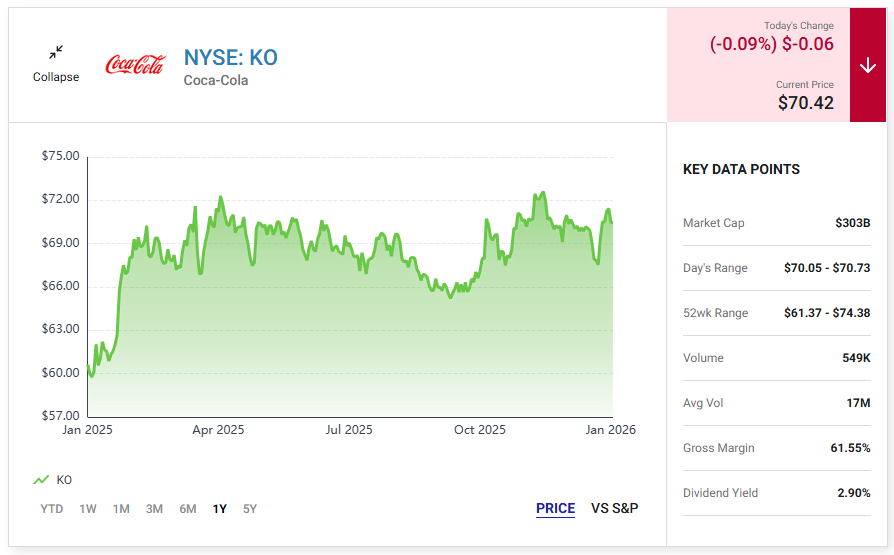 코카콜라 Coca-Cola (KO0.09%)는 2.9%의 수익률을 기록하며 오랜 배당금을 지급해온 우량주로, 64년 연속 배당금을 늘려왔습니다.