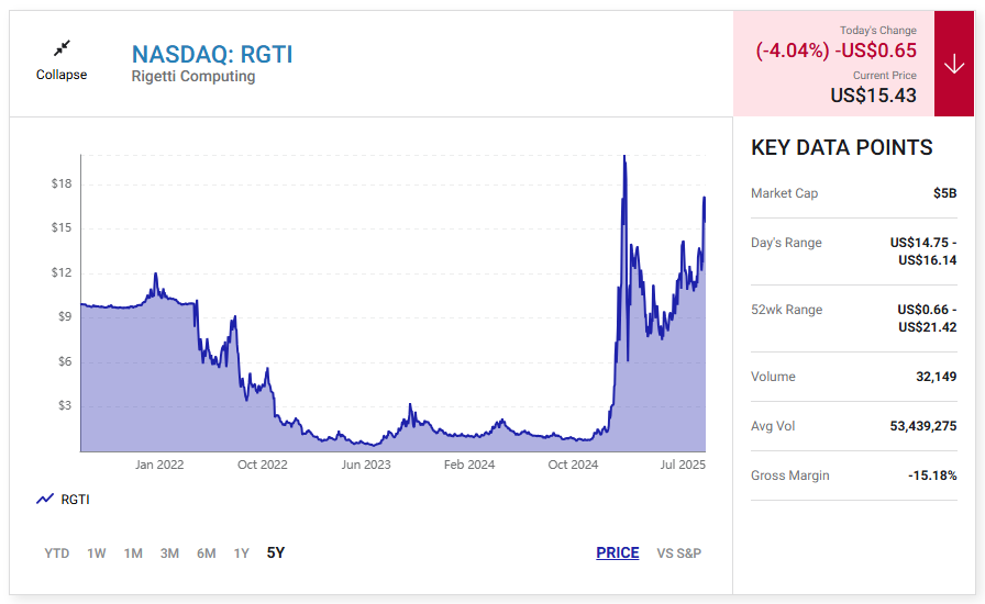 그중 하나는 양자 칩, 시스템 및 클라우드 기반 서비스 개발업체인 리게티 컴퓨팅 Rigetti Computing (RGTI -4.04%)이었습니다.
