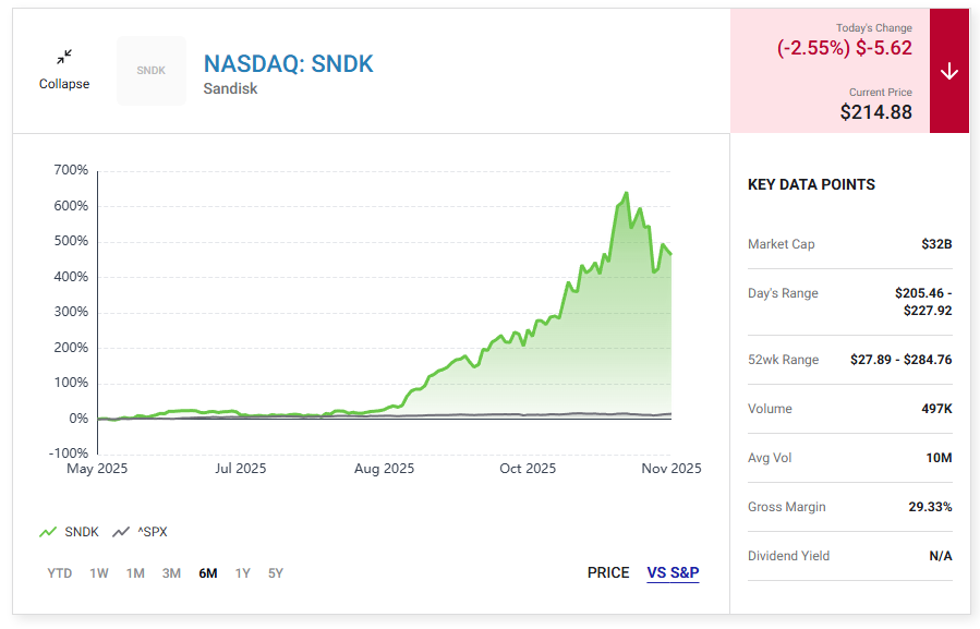올해 초 웨스턴 디지털에서 회사가 분리된 이후 샌디스크는 512%의 상승률을 기록하며 S&P 500 지수의 11%에 불과했던 것에 비해 더 넓은 시장을 휩쓸었습니다(이 글을 쓰는 현재 기준).