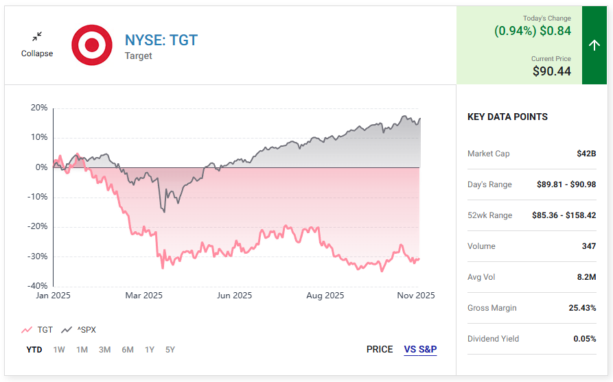올해 S&P 500 지수가 상승하면서 Target은 랠리에 불참하고 대신 약 32% 하락으로 향하고 있습니다.