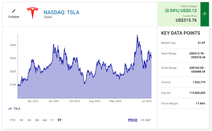 테슬라 주가는 사상 최고치 대비 약 34% 하락했지만, 수익 감소에 비하면 하락폭은 미미합니다.