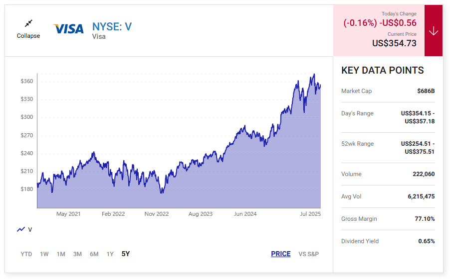 즉, 가장 일반적인 밸류에이션 지표인 주가수익비율을 고려할 때 Visa의 현재 주가수익비율은 5년 평균보다 약 5% 높습니다.