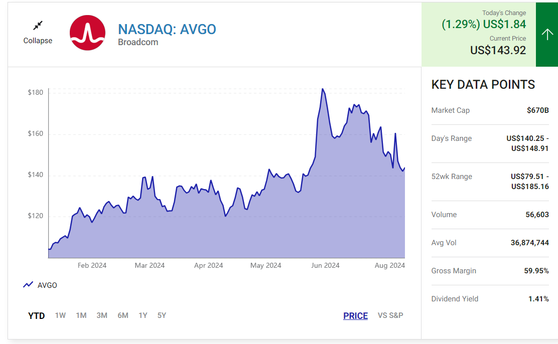브로드컴의 주가는 6월 고점 대비 20% 이상 하락했습니다.